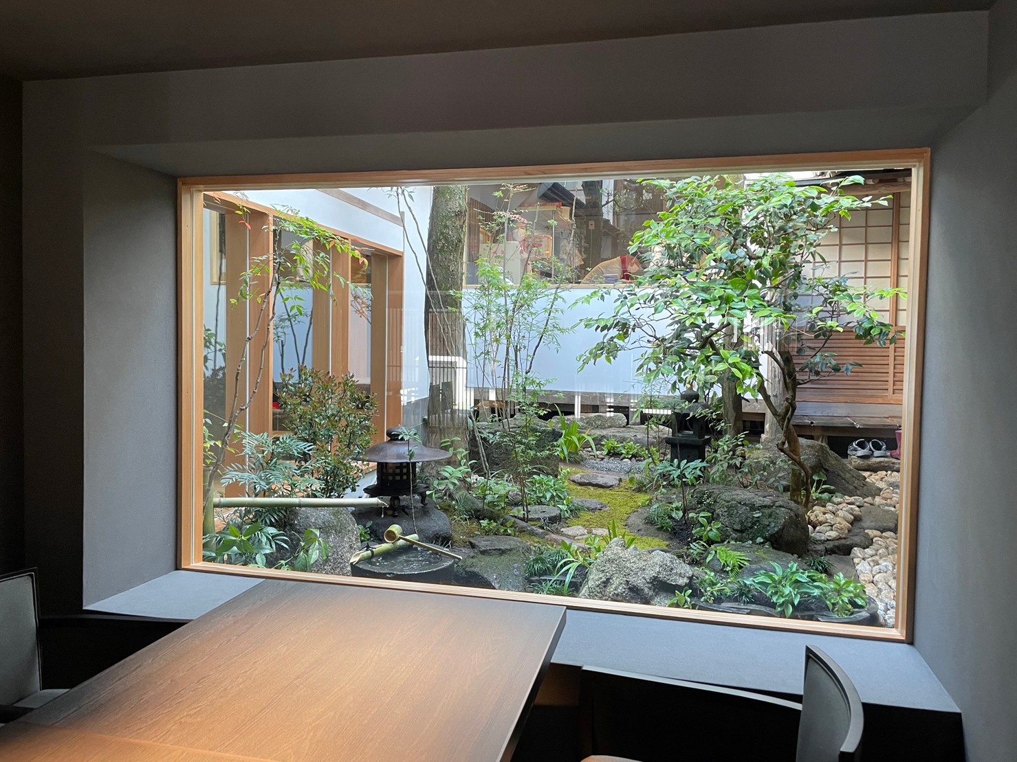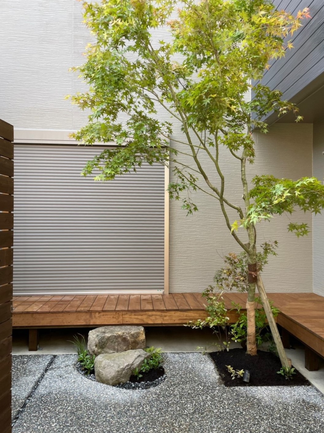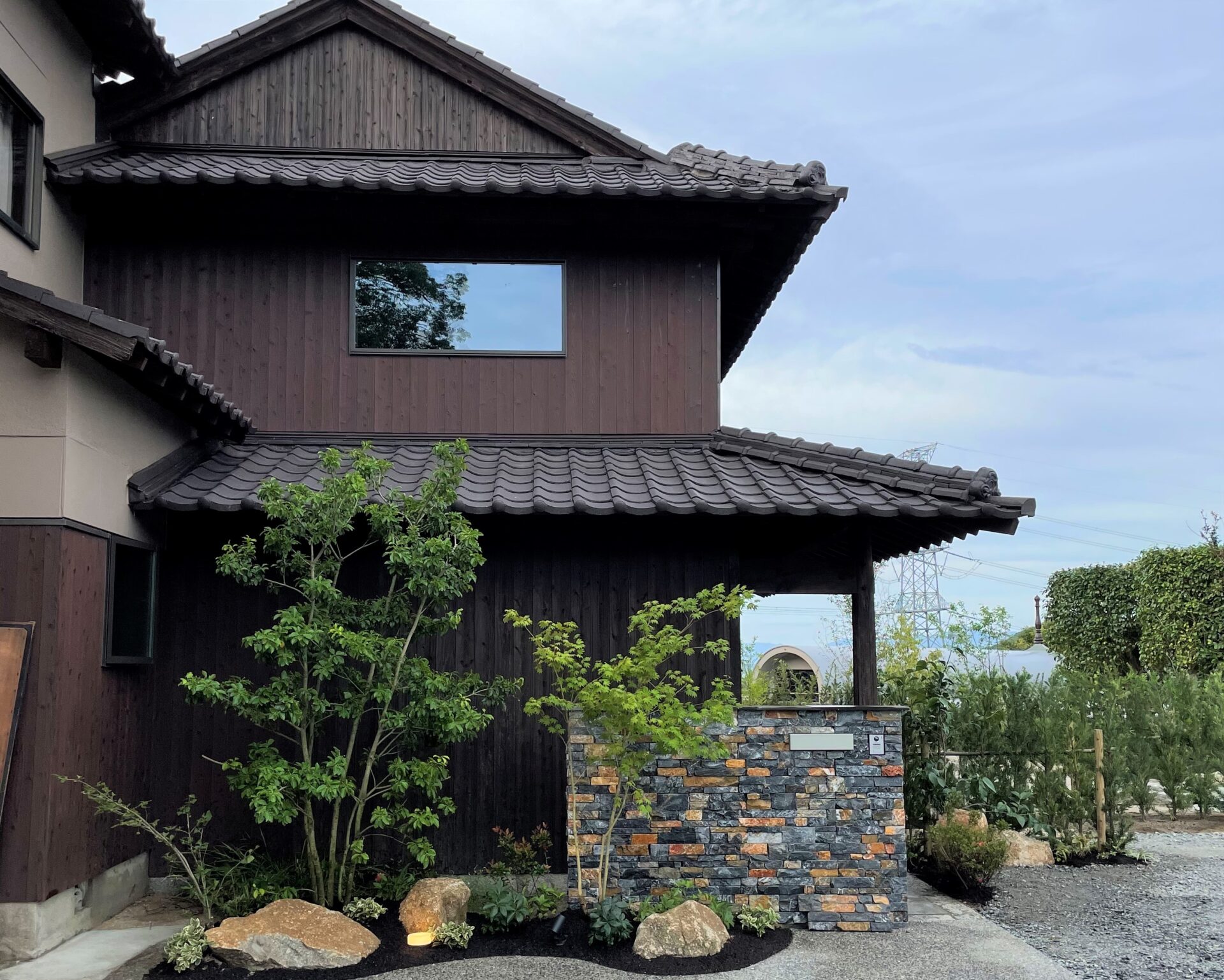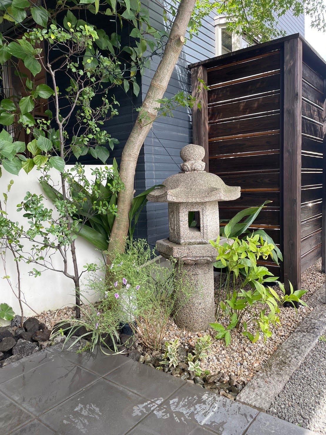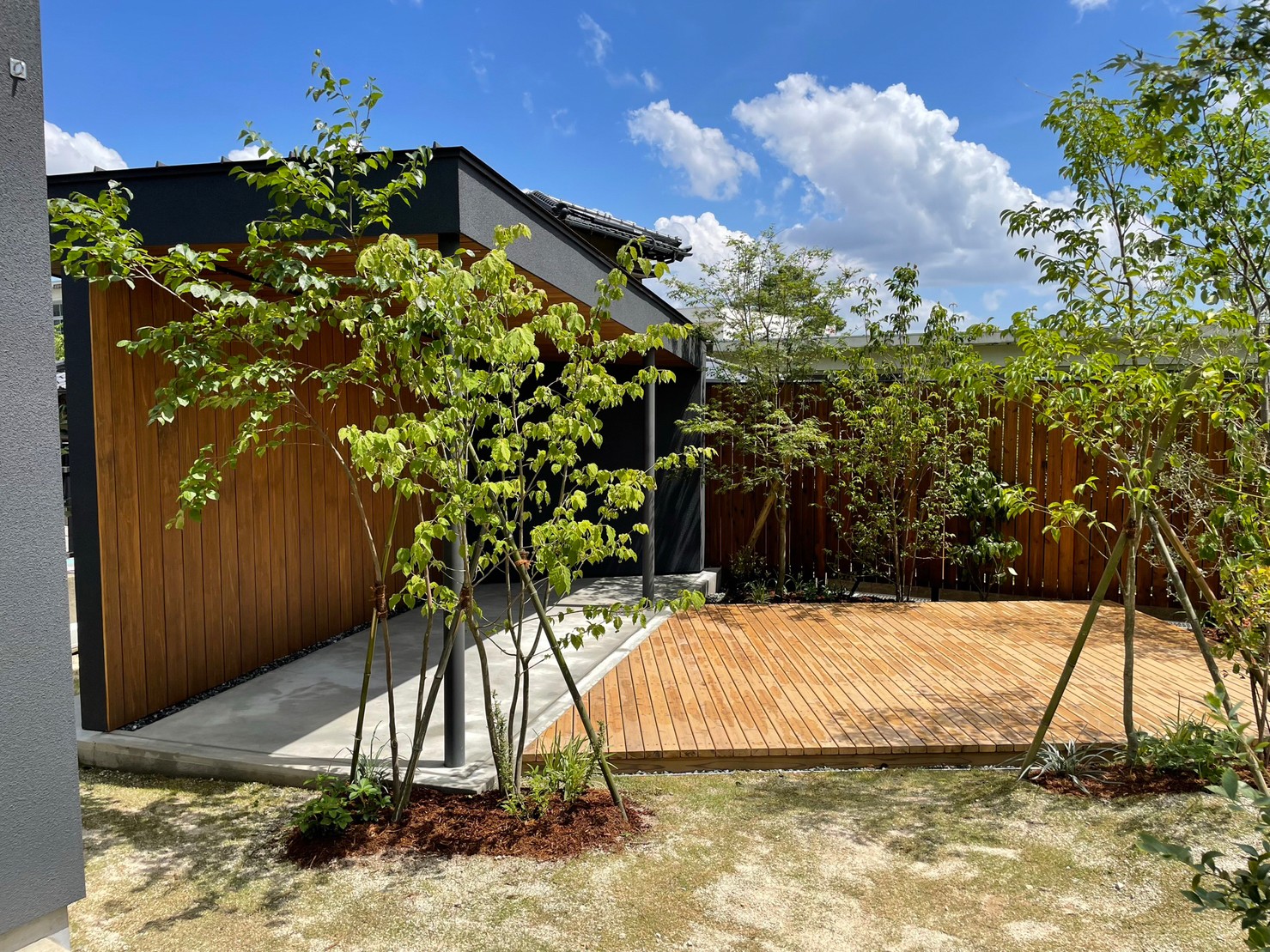 入口側は、木フェンスの大和張で、風は通しつつ、しっかり目隠しされています。既存花壇前は、アイアンフェンスで駐車場側からも植栽の雰囲気が感じられるようにしました。